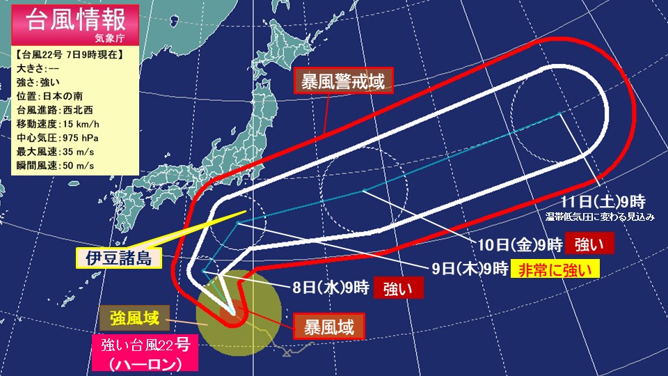 あさって9日(木)には、非常に強い勢力で伊豆諸島に接近する見込みです。