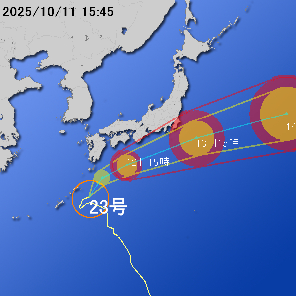 台風第23号は、13日には伊豆諸島にかなり接近するおそれがあります。伊豆諸島では、暴風に厳重に警戒してください。また、うねりを伴う高波、土砂災害、低い土地の浸水、河川の増水や氾濫に警戒してください。
